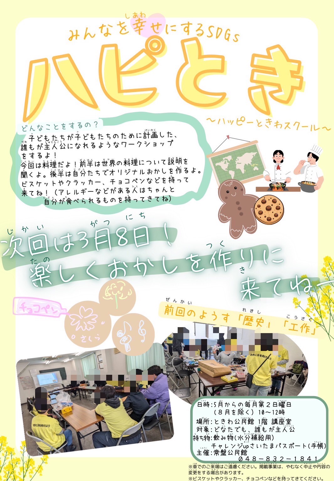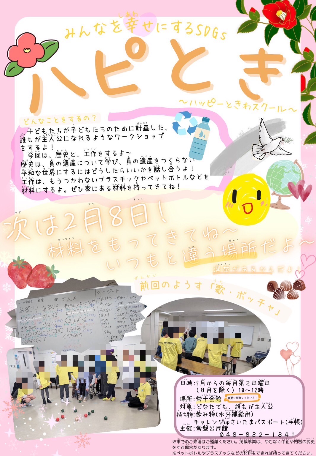 | 🍀さいたま市モデル公民館事業「子どもの幸福度アッププロジェクト」実行委員募集🍀 *来年度から2年計画で活動 *子どもによる子どものための活動を子ども自身がデザインします~!! *国籍、年齢(学年)、地域、をこえて “共に今を生きている仲間として”子どもの幸福度アップを目指します~!! 🌸2025年度の主な活動🌸 2026/2/28更新 4月27日(日)家庭教育学級 常盤公民館だより